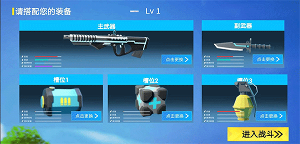 2、在游戏开始之前我们需要搭配自己的武器,选择厉害的主武器和副武器,选择差不多了之后进入战斗;