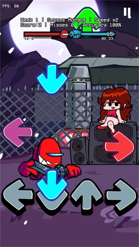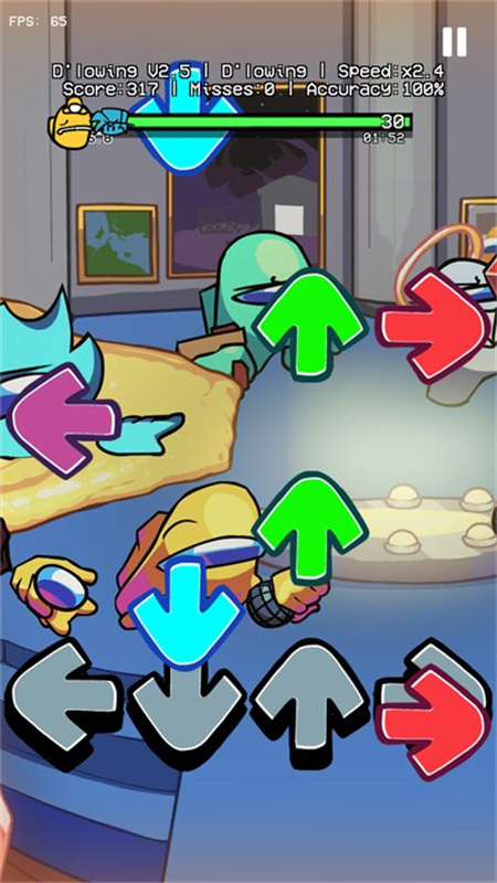 4、正式进入游戏后,左下角的方向键是打击按键,进入音乐对局,方向键头会逐渐从屏幕下方升到屏幕上方,在下方的箭头与上方固定的箭头重合时,玩家需要按下对应下屏幕上的方向键,才能得分。