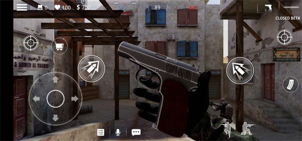 3、我们刚进入游戏用的是手枪,这样在游戏中很没有胜算,所以这个时候我们需要去购买一个好一点的枪,点击方向上方的购物图标;