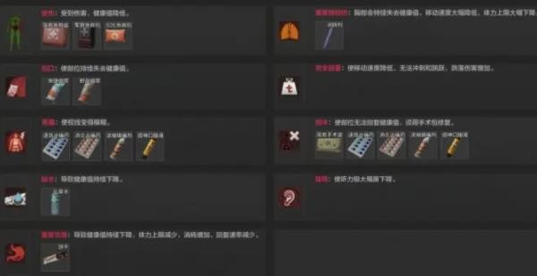 其实新手先锋最经常面临的,是受伤、创口和损伤这三个状态。对应的医疗物资依次是医疗包,绷带和手术包。一般来说,大家会选择找个安全的角落先打绷带移除持续掉血,再做手术治疗损伤,最后再打医疗包回复满健康值。