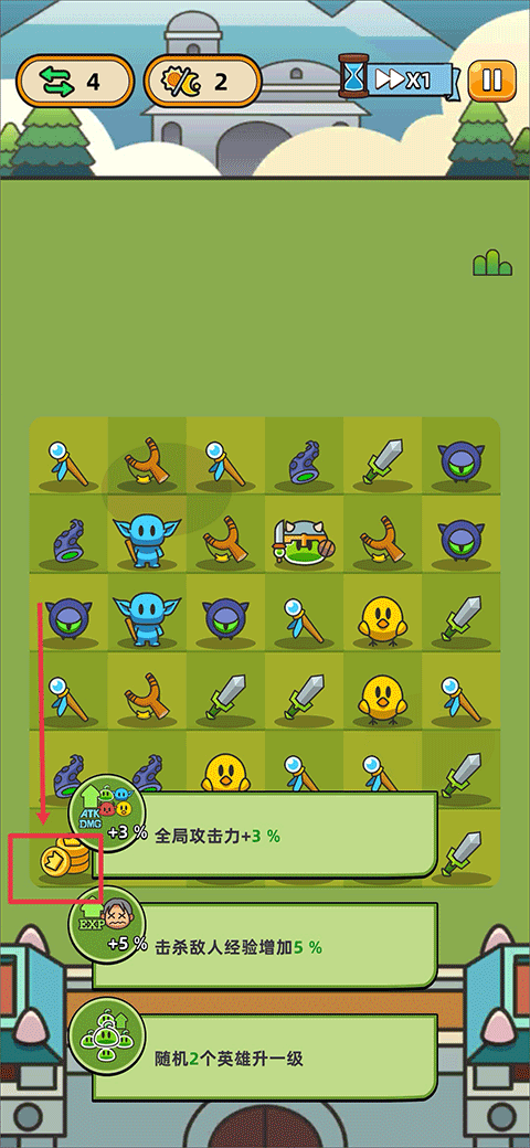 1、双击打开勇闯要塞手游,你可以通过滑动来移动物品位置,当3个或3个以上物品在同一行或一列时可合成不同属性的英雄;