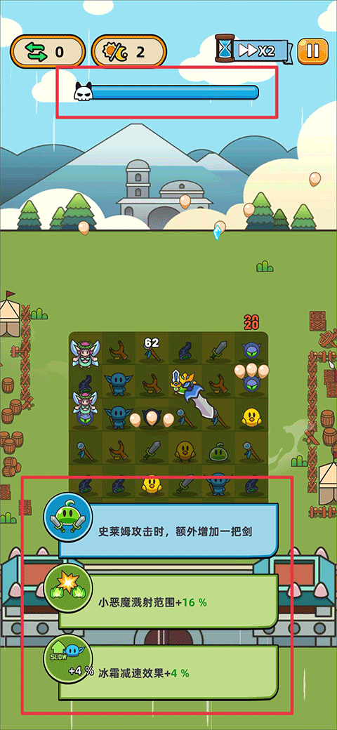 5、我方英雄在成功抵挡出现的敌人后会获得分数,当上方进度条满时同样可以解锁技能选择功能;