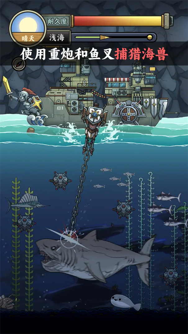 1、你是方舟上唯一猎船的船长,你需要不断的出海捕猎来满足人们的饮食需求和为方舟的升级修理寻找材料。
