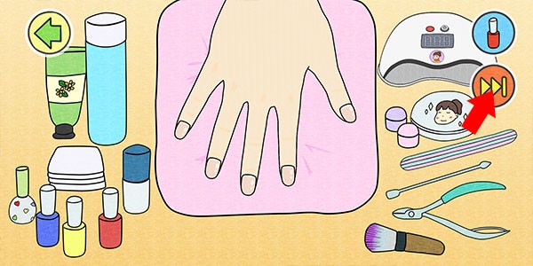 4、选择后进入美甲界面,按照提示使用指定工具对指甲进行手部护理,点击右上方可快进