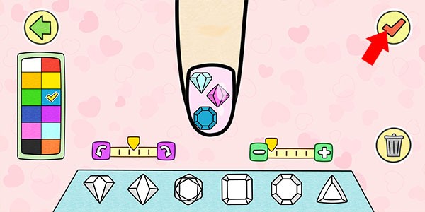 6、来到装饰物品阶段后,点击即可添加指定装饰物,拖动可改变位置,左方进度条可调整旋转角度,右侧进度条可调整装饰大小,完成之后点击右上角可完成当前指甲的装饰,返回手部界面,其他手指同样按照前方步骤装饰,并点击右上角勾号即可完成当前装饰