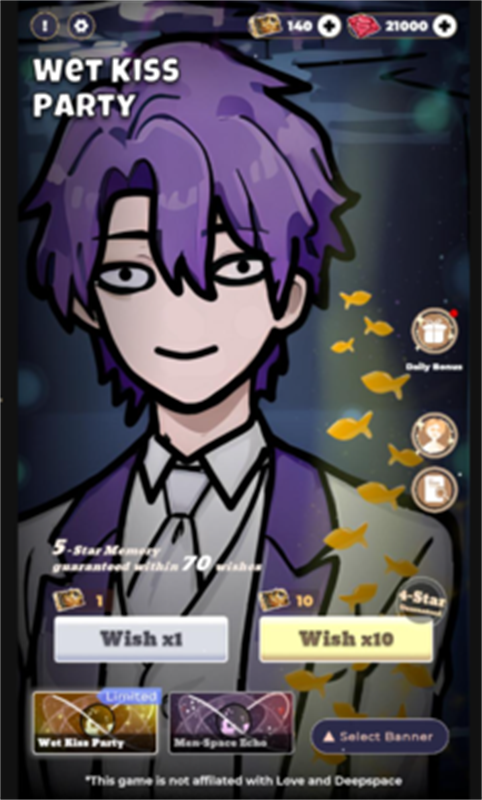 可爱的许愿者是女性向恋爱游戏《恋与深空》的恶搞向抽卡模拟器游戏,在画风上和知名原神抽卡模拟器游戏《Silly Wisher不是原神》十分类似,在还原了真实的抽卡界面与概率的基础上,将所有角色形象全部更换为了十分有趣的恶搞画风形象,让玩家能够感受到更加轻松愉快的抽卡模拟体验。除此之外,可爱的许愿者集成了恋与深空原作从开服至今的所有卡池,玩家可以回顾先前的卡池,并自由选择喜爱的卡池进行抽取,感兴趣的小伙伴们快快下载,俊男帅哥们正在等待着您的邂逅!