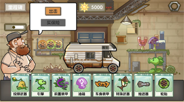 3、选好配件后点击出击按钮就可以开始闯关了,点击买保险可以让你在对局里获得更多阳光。