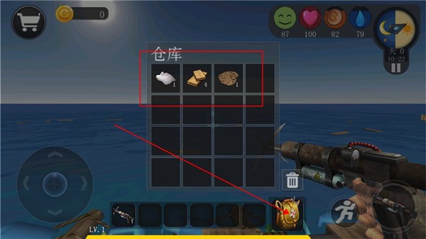 4、在海上进行不断的捕捞,储存生活的物资,捡取道具来修理船只