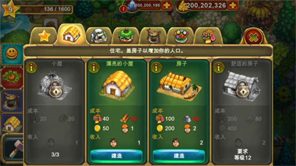 接下来其他的建造功能也是如此操作,不过不同的建造所能带来的收益不同,玩家可以根据你的所需来建造更多偏向与资源缺乏的一块,比如想要获取金币利润,就要建造房屋,所有的房屋都能产生利润,可能不多,但稳定。
