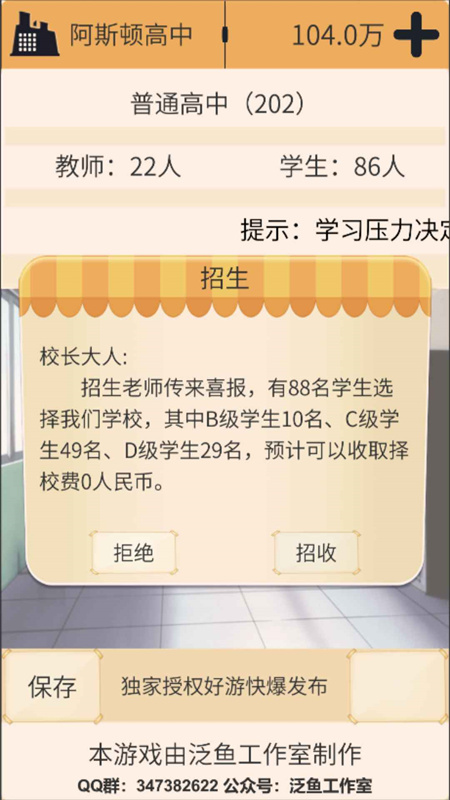 点击招收后,就能看到招收效果,学校的学生分为SABCD等多个等级,等级越高的学生学习越好。我们所设定的招生500人目标完成后,就可以开学了。