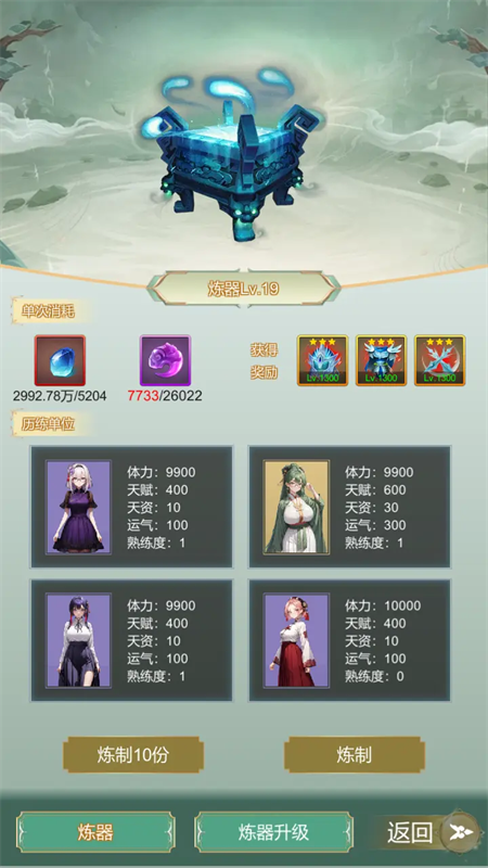 1、经营宗门资源,升级灵田、灵矿和修炼塔,定时领取灵药、矿石等产出,利用资源解锁炼器、炼丹功能,为宗门的发展提供物资支撑。