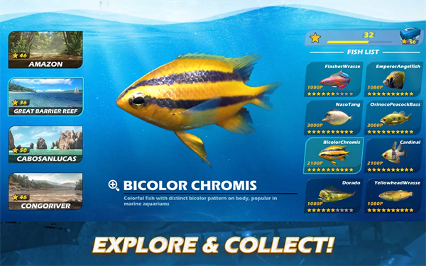 4、开放式的渔场世界,自由探索各种钓点,发现不同的鱼类乐园。
