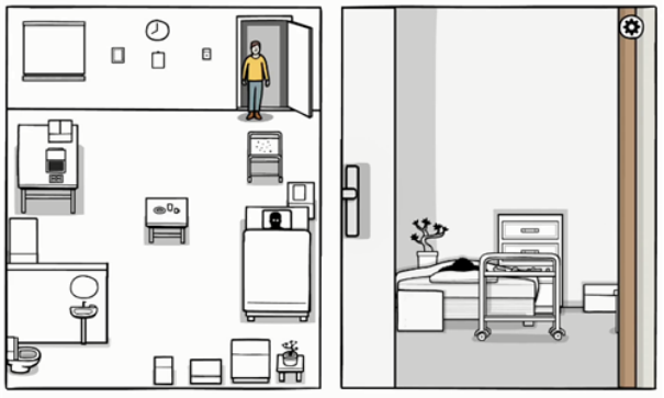 4、接下来到了查房时间,点击门旁边的按钮,就会有人过来解释我们为什么会出现在这里,问我们的姓名和现在的年份和今天是几号。