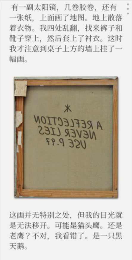 往下查看天鹅画像,直接点击就可以了,得到镜像文字,翻译过来就是:镜像从不说谎。97页