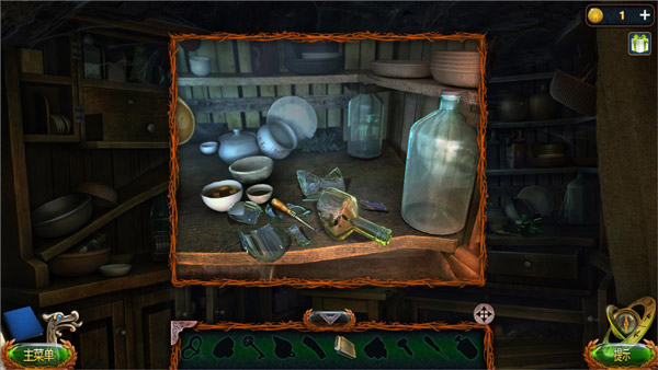 10、进入后,1处点击,砸碎瓶子得到凿子,同时左侧点击得到火柴盒;