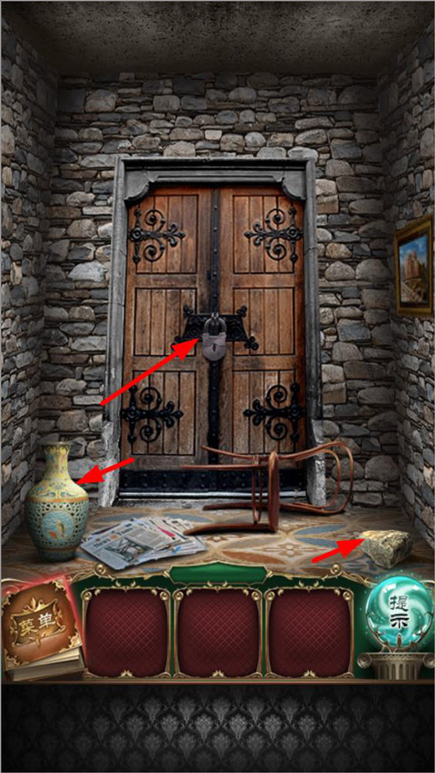 2、第二关就没有提示了,我们先捡起右边的石头打碎左边的花瓶,拿到钥匙,用钥匙打开大门,进入第三关。