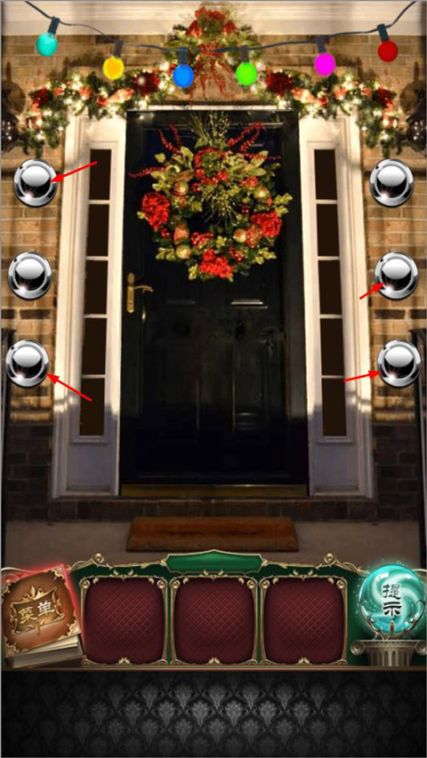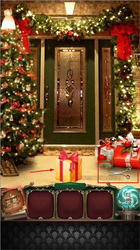 7、第七关,我们把右边的礼物移到中间,看到地上有一把剪刀,我们用剪刀打开中间的礼物,拿到一把钥匙,打开大门,门打开之后进入第八关。