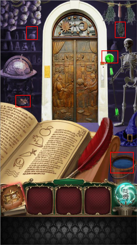 6、第六关,到了第六关我们是一个寻物游戏,在左边架子上拿到一颗苹果,下方拿到一直老鼠,右边拿上胡萝卜和骷髅上的宝石,最后点击水,门打开,进入第七关。