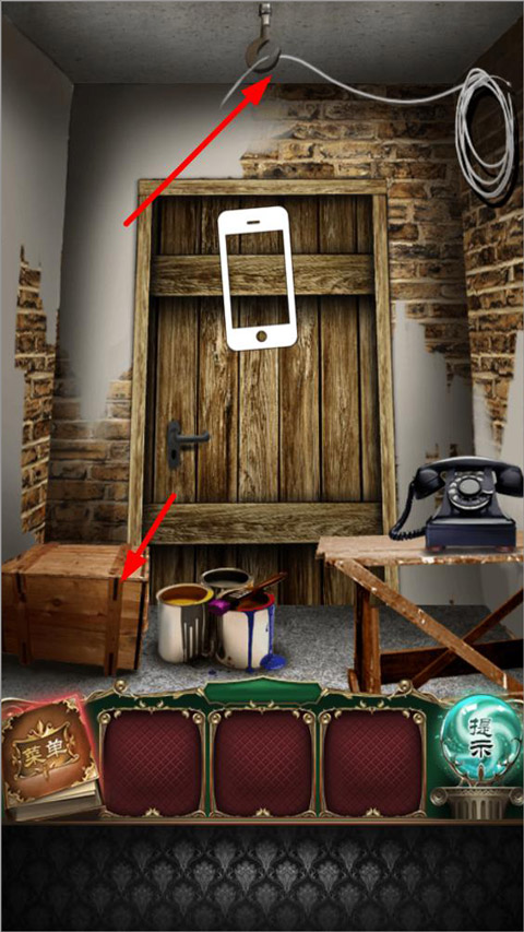 10、第十关,这一关我们摇动手机,掉落下一个铁球,用铁球敲碎左边的箱子,拿到一把钥匙,用钥匙打开中间的门。