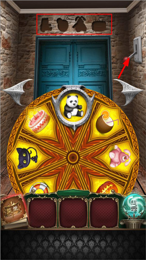 9、第九关,我们在中间的转盘上选择门上面的图案,选择正确的图案之后按右边的拉杆,四个图案全部选中在,门打开,开始第十关。