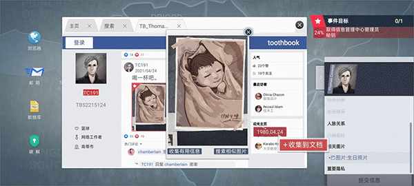 玩家通过浏览器搜索功能收集目标对象的基础信息。
