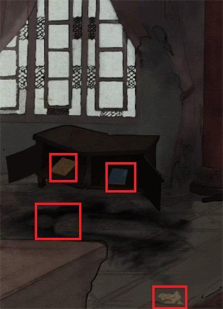 4、进入房间之后,可以在整个房间当中可以找到三分文件。点击地上烧焦的痕迹可以得到线索,在这里将要进行丁妙妙的态度,如图将线索放上。