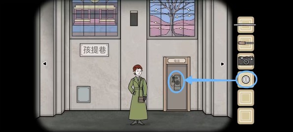 1、回到婴儿车附近,点击女士身上的怀表,就能发现这个符号,然后参考海报上的图案来描绘这个图案,需要按照左上、左下、右的顺序来解锁,会出现10点15的时间