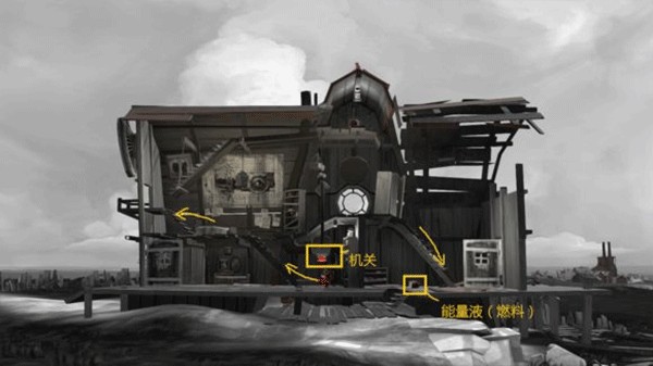图中高亮的是机关,橙红色,所有图中都是这种颜色机关,由于人只能控制前后和跳跃动作,所以按钮基本就是顶,踩,推 这几种。能量液用于驱动后面的 “房车(帆车)”。能量液不直接叫燃料,因为它后面可以用来灭火,叫燃料有点违和。