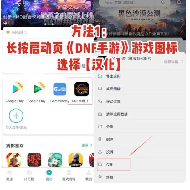 如自动汉化未成功,可选择以下两种方式进行手动汉化:长按启动页《DNF韩服》游戏图标或在游戏界面的悬浮球内选择“汉化”功能。