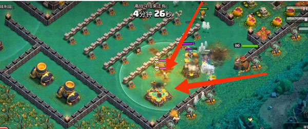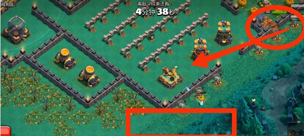 1、右侧红圈内下女武神×2,女武神会自动破墙,破墙后会去打圣水罐。