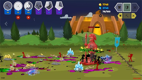 1、玩家将亲临激烈刺激的战场,指挥你的火柴人勇士进行作战,而且游戏中有着各种火柴人士兵可供训练;
