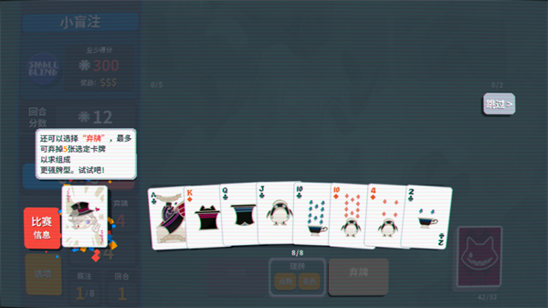 3、玩家初始携带一个52张扑克的牌组,手中始终有8张牌,出牌或弃牌后会自动补满,但次数均有限制。