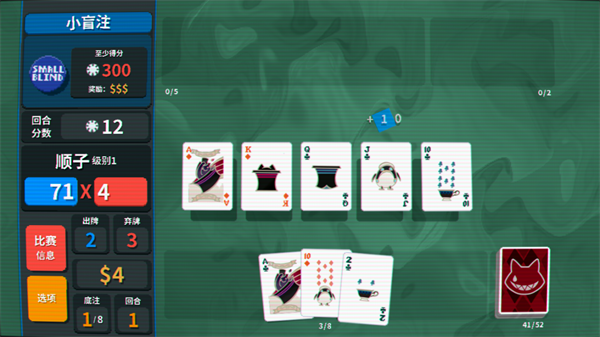 保留了小丑牌的玩法,玩家需要灵活使用卡牌,针对丰富的情况做出多样的策略规划,发挥卡牌的全部效果,掌控局势,完成自己的挑战。