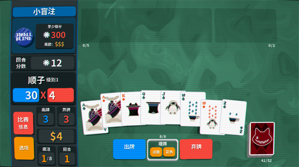 1、玩家的游戏目标就是不断赚取筹码来击败对手的盲注。盲注分为小盲注、大盲注以及Boss盲注三种。其中Boss盲注会对玩家的操作有所限制(比如方片牌不计分等),通关后“底注”会增加,难度也会随之提高。