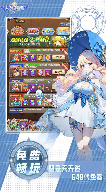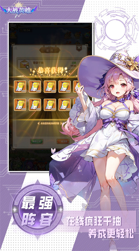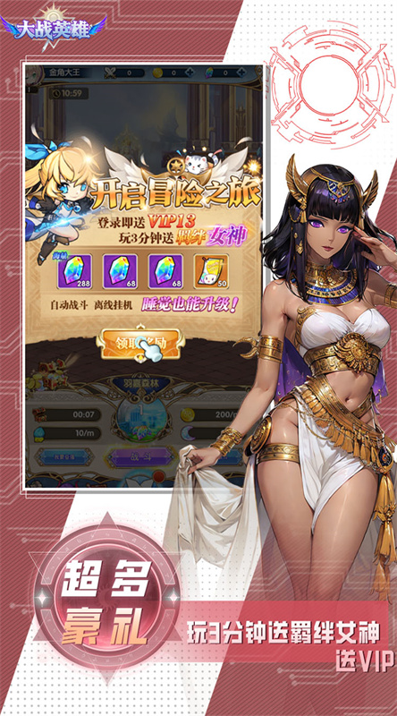 大战英雄是一款二次元放置挂机类游戏,玩家们将在这个奇幻的世界中自由的探索和冒险,集结专属的英雄小队,和全服的玩家们实时交流,同台竞技,在挂机中积累战力,携手击败邪恶势力,上线就能够获得丰厚的福利奖励,还有各种的强势阵容加入,快速的打造自己的小队,还有各种的装备可以轻松获得,零氪也能够凑齐全部图鉴,感受游戏带来的乐趣。