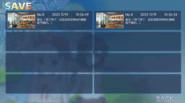 点击游戏下方箭头,可保存多个游戏存档,每个存档有时间、剧情对话等信息,方便随时读取进度,继续游戏。