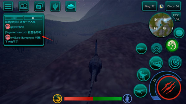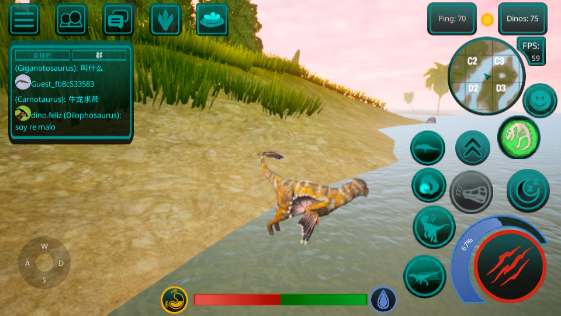 3、食物提取,如果恐龙是掠食者,那么你需要杀死其他玩家的恐龙才能得到自己的肉,如果你是草食动物,那么食物就更容易了,你需要特殊的蕨类植物,你可以得到足够的他们! 地图上任意湖泊、水库都可以饮用。