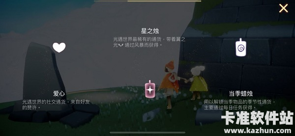 游戏世界中有很多蜡烛,点燃它们或者接近点燃的蜡烛,我们就能收集到烛光,收集满一根后点击就可以铸造一根新的蜡烛。点击游戏界面的左上角可以看到我们拥有的蜡烛数量。从左到右依次是普通蜡烛、季节限定蜡烛、爱心。这3个是游戏中的货币。其他人赠送给自己蜡烛时,我们就可以获得爱心。
