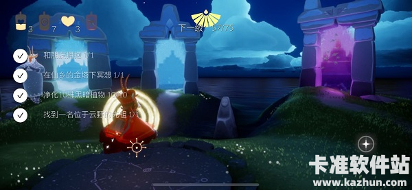 找到黄色人影,与它们互动 收集“光之翼”,我们的 飞行技能就可以得到 升级――斗篷背后 星星的数量就代表我们的飞行级别。