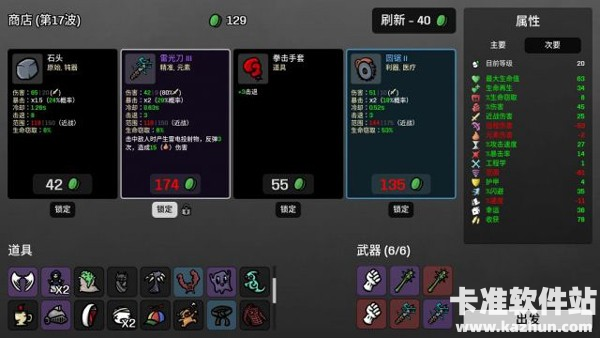 总共20波敌人,每一波时间从20秒逐渐增加到90秒,结束后会开启商店,商店可以购买道具和武器,也可以消耗材料来刷新。