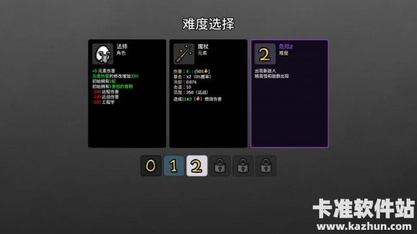 游戏共有5个难度,各有不同的buff,通过一次后所有人物均可选择下一个难度,且不同的人物通关会解锁不同的武器。