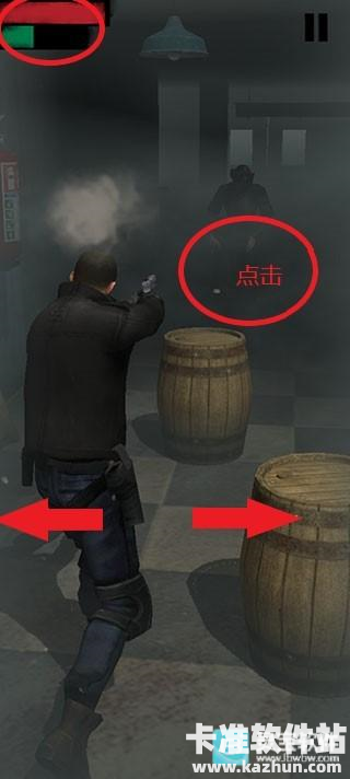 游戏内人物会自己往前移动,滑动屏幕人物会飞踢僵尸,踢到僵尸脑袋可以给他致命一击,点击屏幕会使用武器攻击,武器威力大,几枪即可击败僵尸,但需要注意子弹状况,屏幕左上角红色为血条绿色为弹药。