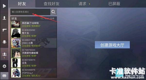 适合大家添加线下的小伙伴为好友时使用。由于对峙2手游中玩家彼此的ID是不会出现重复的,因此我们只需要记住小伙伴的名字或者数字ID,然后同样点击主界面右上角的标志为两个人的按钮,选择ID搜索并输入小伙伴的名字即可。