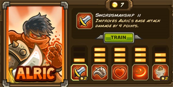 战士Alric是我们在游戏中第一个也是唯一一个免费使用的英雄。攻守平衡,技能也算给力,属于近战中能够独当一面的英雄人物。当英雄的沙之勇士技能升到顶级后,可以考虑让该英雄在火炮或弓箭塔的配合下独挡一路,初期可以有效的缓解多路敌人带来的财政压力。配合支援部队,外加英雄本身和三个沙勇士,可以瞬间以六人之力堵住敌人的进攻。