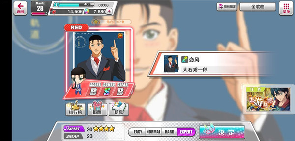 歌曲分为:通常,活动,期间限定,限定每月更换,本月即将结束,大家记得把大石的《恋风》通关哦。其次,尝试ex时如果没有把握可以组一队生命恢复的卡保命,因为这个游戏无法通关会扣体力还没有奖励,很不划算的