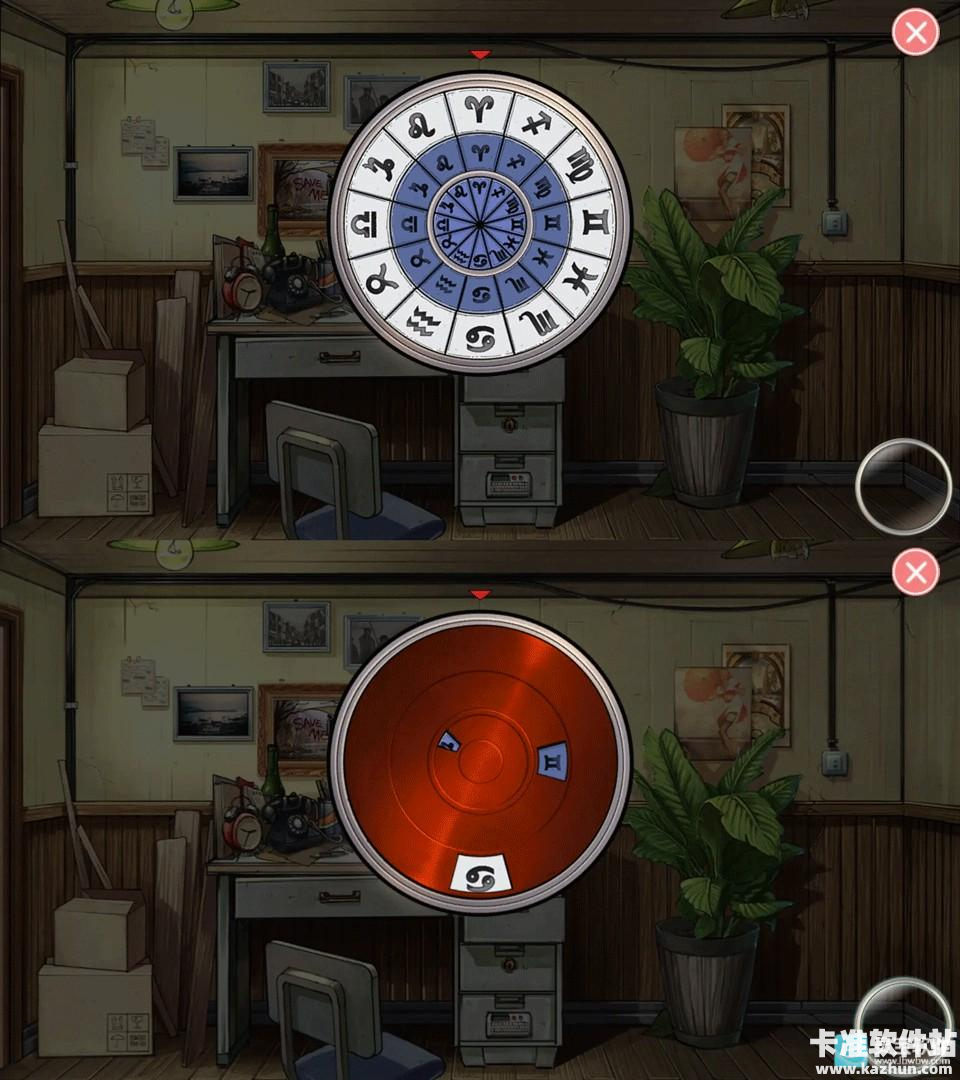 43、向左走两次,调查桌子,圆形盒子上红色箭头下对齐3个白羊标记(3个都在12点方向),然后使用【红色胶片】,可以看到3个星座标记(巨蟹,双子,摩羯),把这3个星座标记对齐红箭头(红色箭头下巨蟹(外圈),然后双子(中间),最后摩羯(内圈)),得到【巨蟹座硬币】