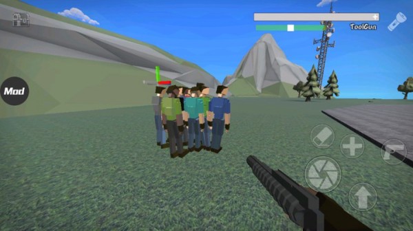 2、左边移动右边射击,点击左上角进行切换武器,使用手中的这把武器对着物体点击,会出现蓝色的引线,将它们连接起来,你可以通过滑动屏幕来移动这些物品的位置了。