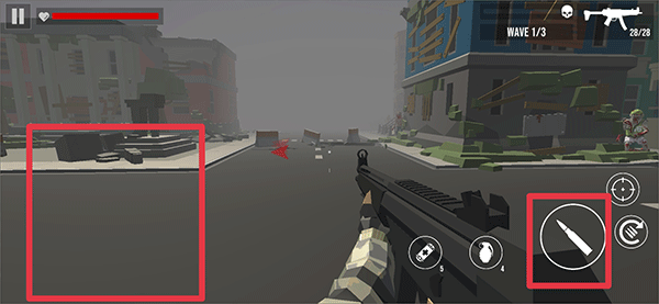 2、在游戏中通过左边屏幕移动来控制方向,右边子弹按钮则是发射弹药击杀僵尸