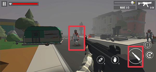 3、然后根据上方红色箭头来寻找僵尸的正确位置,并用武器发射弹药僵尸击杀