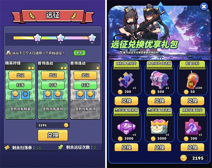 3、第六关开启远征每天也是次数打满,远征金币可以兑换角色碎片或杰出装备等材料。